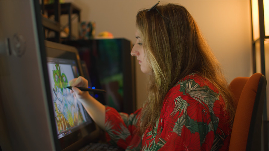 Christine: A lot of the time I’ll draw something completely different. I’ll have another screen open and I’ll take 5 to 10 minutes to just put whatever I want on the page, whether it be characters or little illustrations or something else. Just something that is completely different and then sometimes that kind of gets that weird little energy burst out of me where I just don’t know what to do. And then I can finally be like, okay, take a breath and then you can draw it.