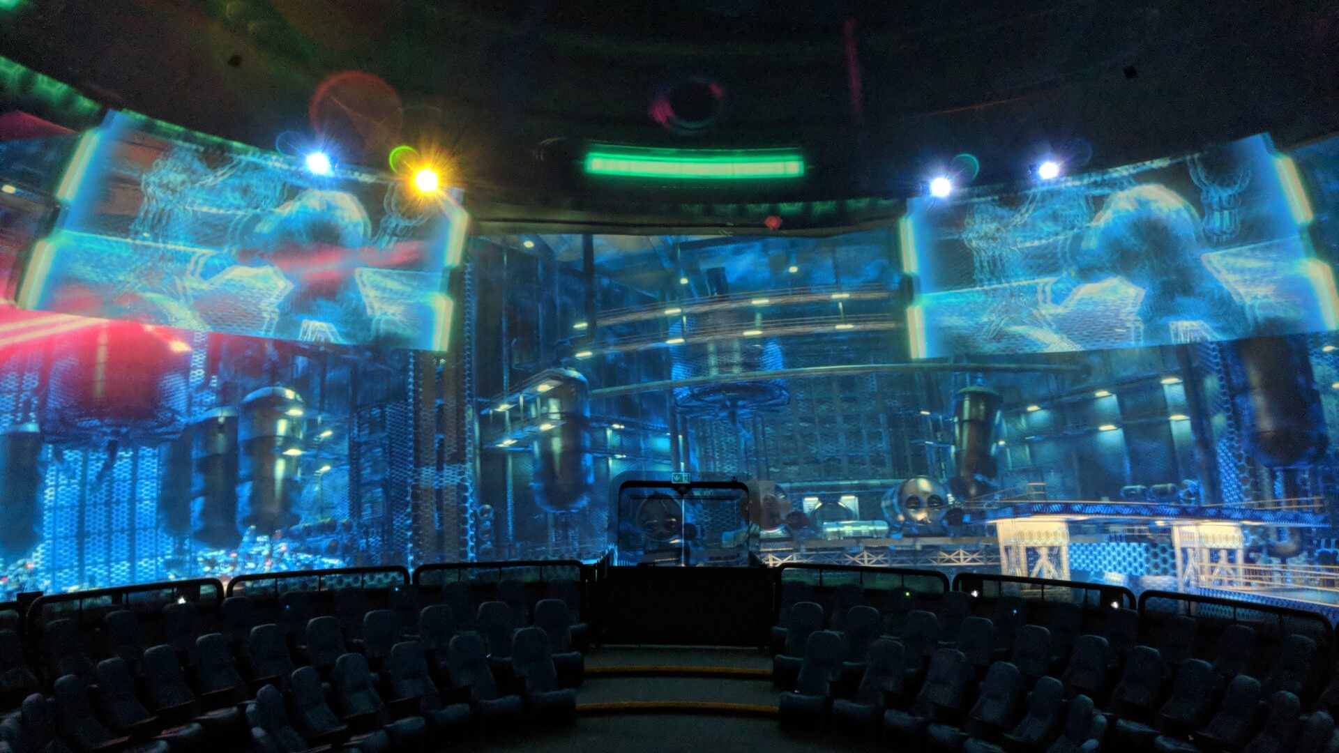 A small amount of time later Disney continued and evolved this tradition of a circular-based theater with the CircleVision Theater introduced in 1955. This was a technological breakthrough allowing a large audience to gain a continuous panoramic view of the media landscape. It was also a major shift in the concept of Theater in the Round as it inverted the audience location with the “actors” and put them on the inside looking out. In fact, they could look all around at the performance, rather than the old method of everyone looking toward the center. From Disney’s lead, media and A/V visionaries continued to stitch together more tightly the screens and bring them overhead in order to more fully envelop the audience within the story.
