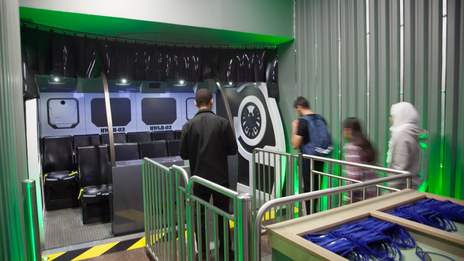 Trainees receive their 3D glasses and enter the custom-designed, side-facing ride vehicle that includes five embedded video monitors and an on-board audio system that is synchronized with the off-board experience throughout the entire ride. The onboard monitors feature information about the vehicle as well as a cockpit cam showing Hawkeye and Black Widow coordinating with Nick Fury.