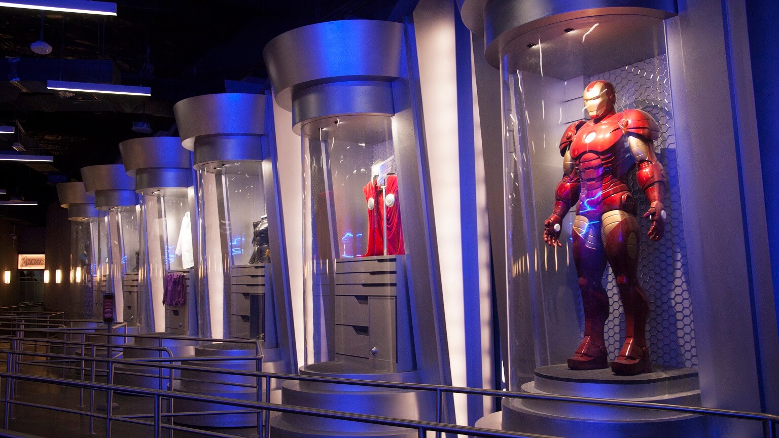 Trainees continue through a conference room where members of the World Council feverishly debate their next steps to deal with the ongoing Ultron situation. Trainees then pass through the armory, which includes the iconic suits of The Avengers encased in glass.