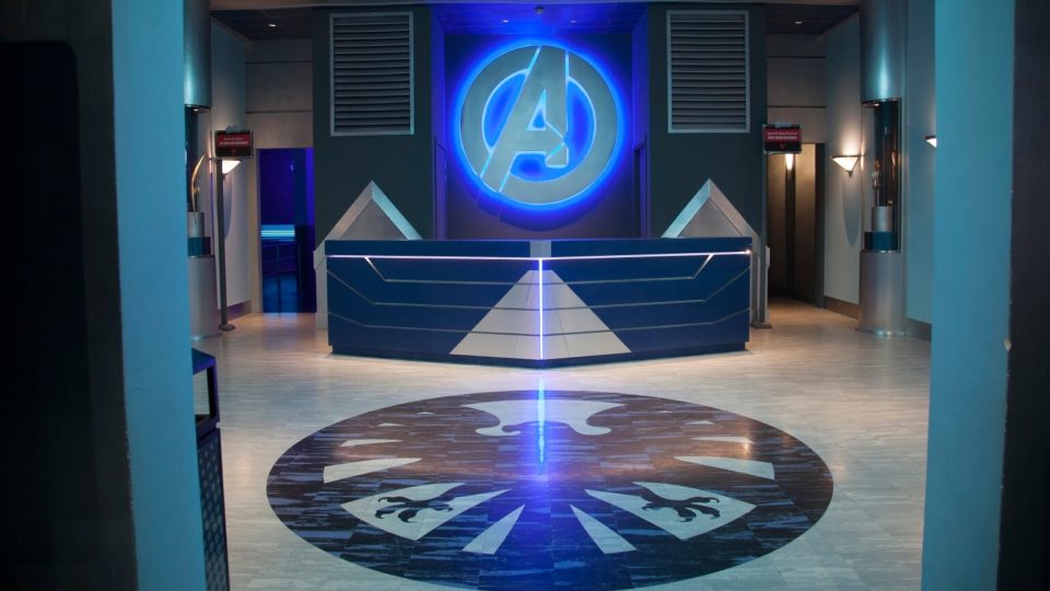 The massive exterior façade of the attraction is that of Avengers Tower, which looks like it has been pulled straight out of the comic books. Past the entrance marquee is the lobby area of the tower featuring a beaming Avengers logo on the wall behind the reception desk.