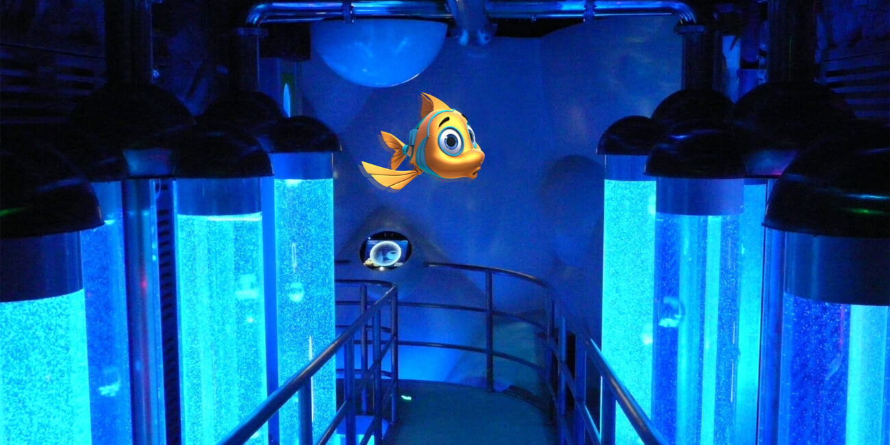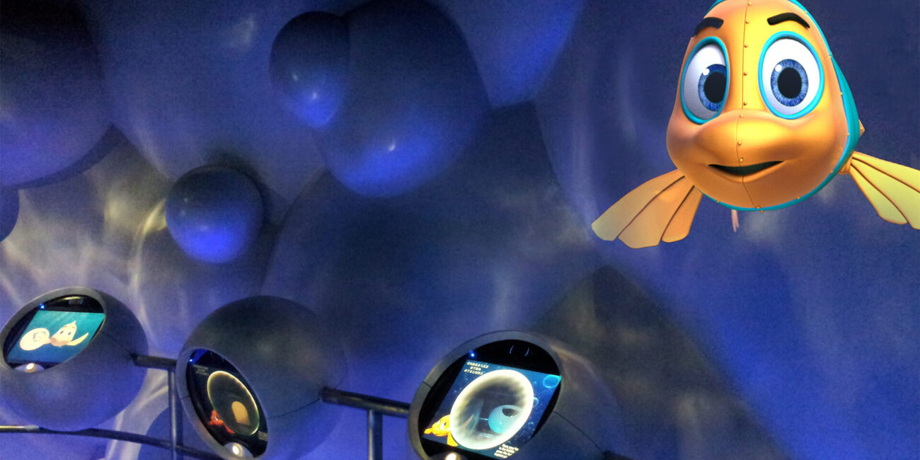 Eight cartoon characters were designed for Deep Sea Odyssey, including Pao-Pao, who is part-fish, part-mechanical submarine. The young, adorable hybrid serves as your animated host throughout the queue and ten-minute ride. He’s joined at varying intervals by a frightening sea monster, a large squid, a school of fish, a whale shark, and a variety of colorful jellyfish.