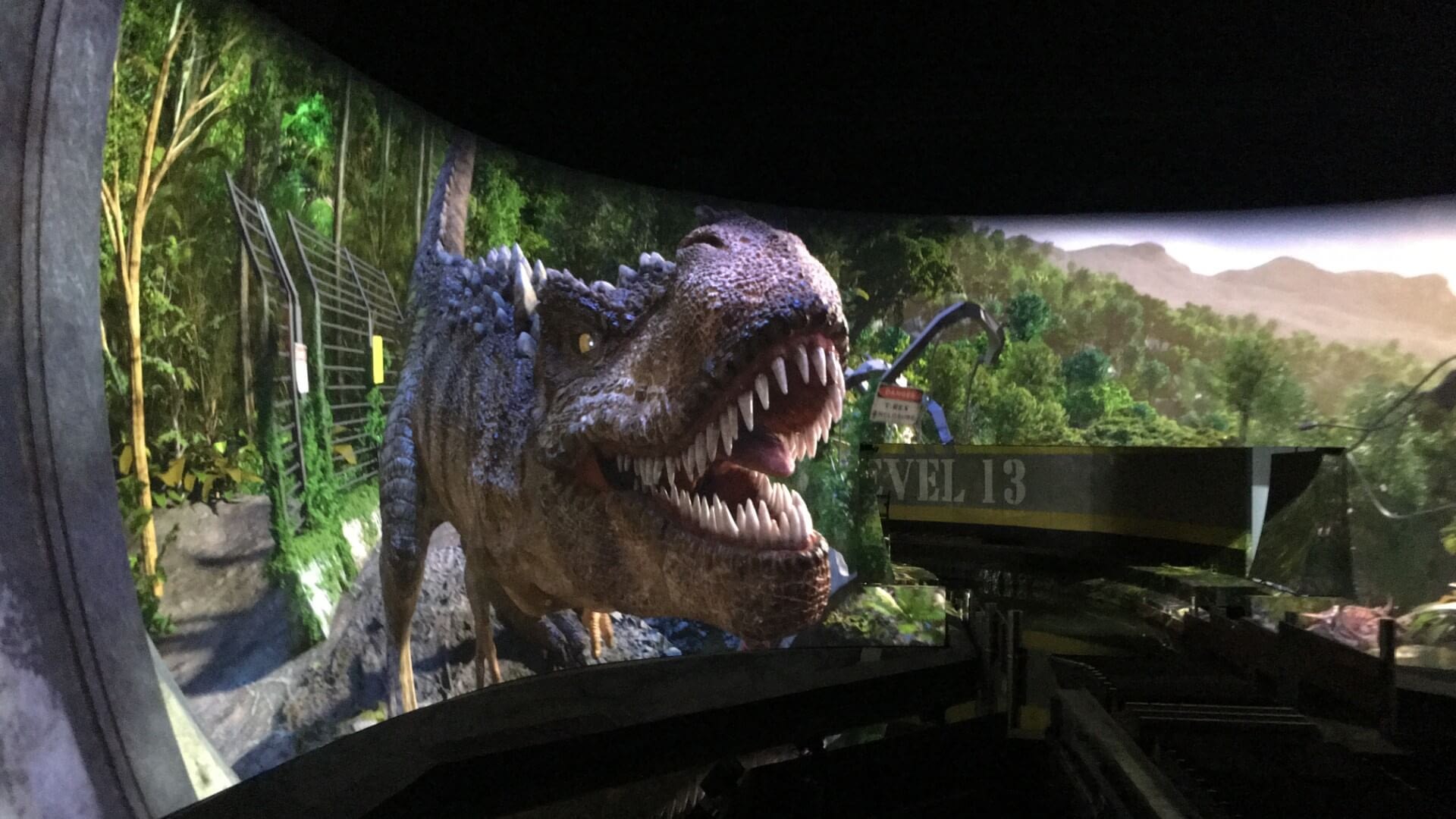 In addition to the media presentation, the attraction featured several other stages beginning with scenic, animatronics, and audio elements. From there, guests journeyed into a motion simulator and then a 4D immersive tunnel featuring wind, water, and scents. The 3D dinosaur simulation was next followed by an exit into a vertical lift tower with views of the indoor park. Guests then drop and splashdown past a giant animatronic T-rex.