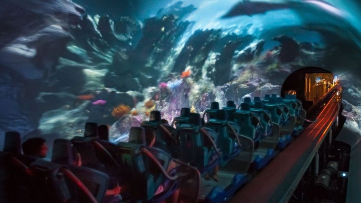 In the final tunnel experience, a wall of bubbles dissolves as riders suddenly find themselves in the midst of a vibrant coral reef. A school of rays swoops in as if dancing through the reef. Energetic music swells and dips with the vivid moving images to provide a choreographed, emotional punch. Meanwhile, the coaster train rocks back and forth, mimicking the feeling of darting through the waves and being swept into the movement of the current.
