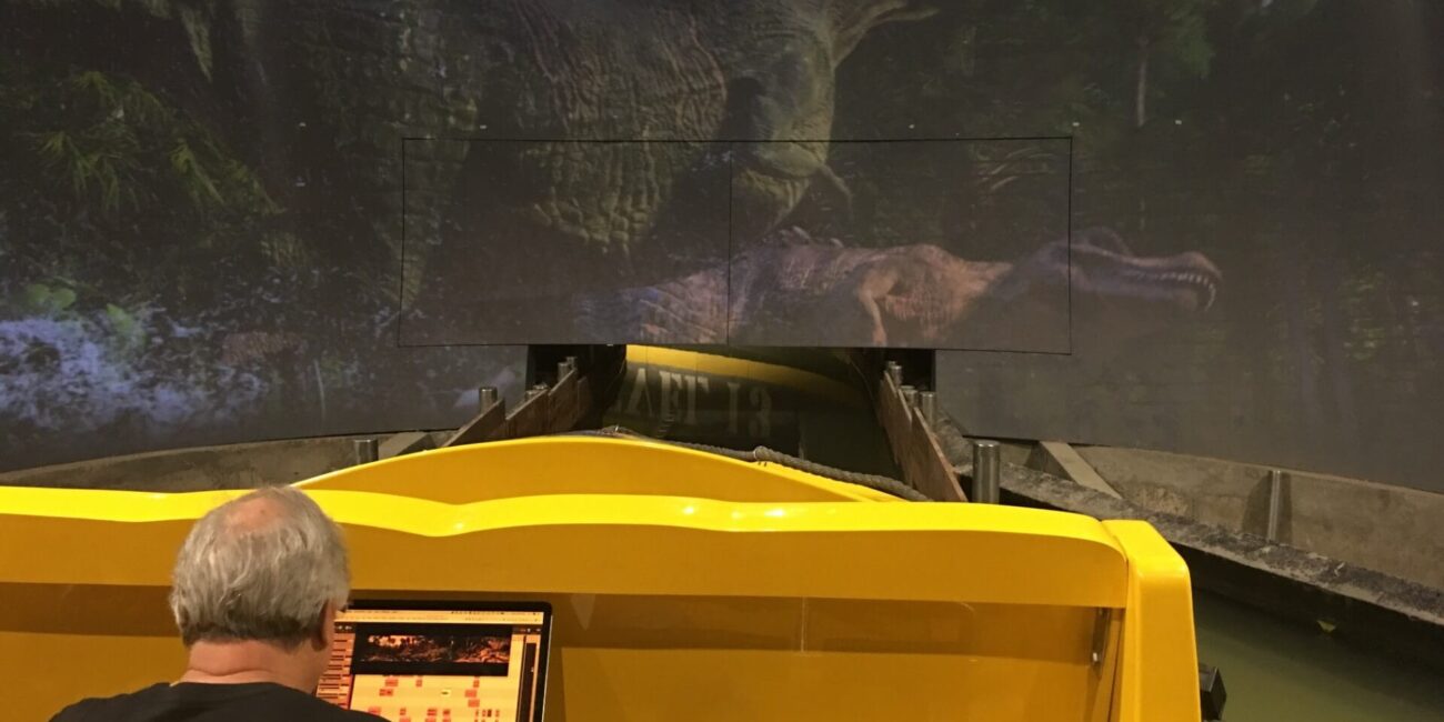 Lastly, our sound designer not only created a custom musical score, but he also had the opportunity to create all of the unique sounds that distinguished the dinosaurs from one another. He dialed in the acoustics for an optimal, immersive 7.1 surround sound experience. The objective was to deliver a stunning, rich, inspired, and enthralling dinosaur encounter that wowed guests in this action-packed environment. Placing riders in the center of the melee, as huge T-rexes roared at them, added a hair-raising dimension to this adrenaline-filled experience.