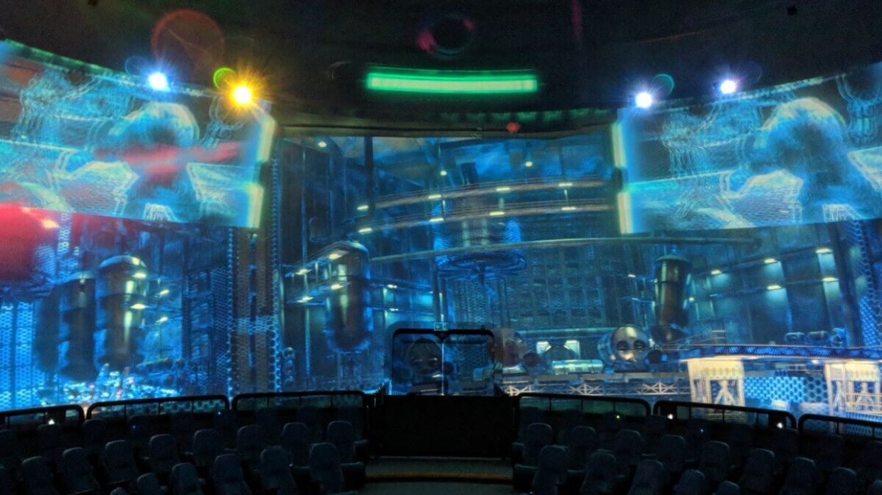 Guests then make their way into the main show’s theater, an innovative space that features a giant compound-curve screen that wraps 220° around the guest. Standing on a “floating” platform in the middle of a massive room, guests are transported back in time. Breathtaking 3D visuals accompany emotional spoken memories from several astronauts. A soaring musical score booming through an amazing sound system and theater effects such as wind, mist, and scent, create a powerful experience that can only be described as out of this world.