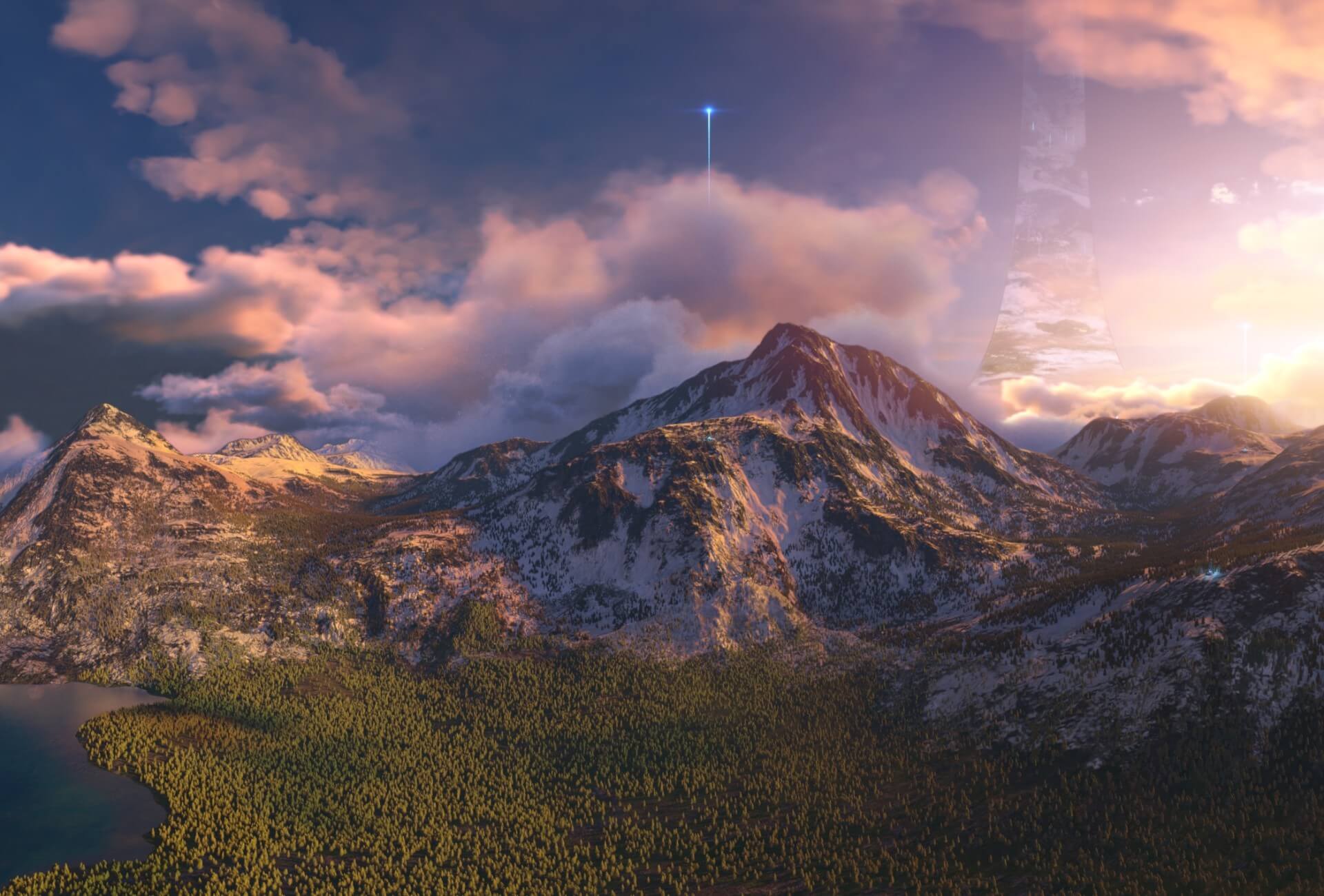 All 3D assets and environments were built and rendered in real-world scale. The ring installation itself measured over 10,000 kilometers in diameter, while the planet that the ring was orbiting was over 95,000 kilometers. World Creator was utilized to procedurally generate all the surfaces for both including all of the lakes, mountains, valleys, deserts, coastlines, and islands.